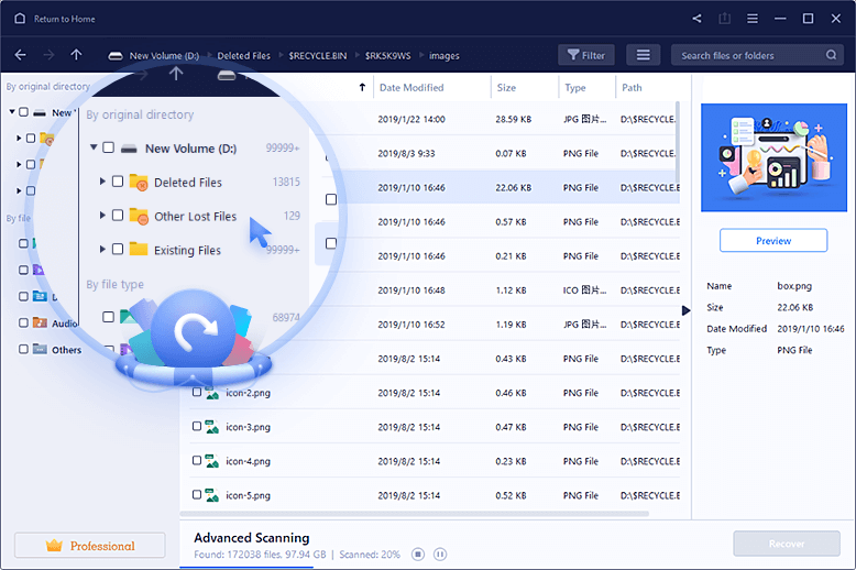 Verlorene Dateien wie Bilder, Videos, Lieder, Dokumente, E-Mails oder Archivdateien einfach wiederherstellen und unterstützt den Filter, die Vorschauoption und den Tiefenscan.