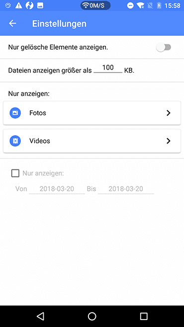Schritt 3. Durch Klicken auf die Schaltfläche Settings können Sie die Dateien auf verschiedene Arten filtern, z.B. gelöscht/ungelöscht, Dateigröße, Dateierweiterung.