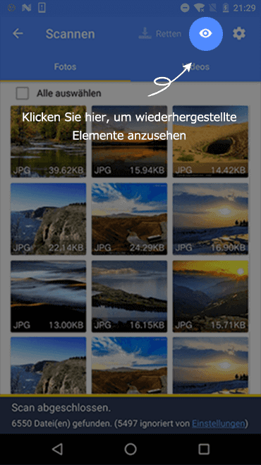 Schritt 4. Nach der Wiederherstellung können Sie die wiederhergestellten Fotos/Videos ansehen, indem Sie auf das kleine Augensymbol oben in der Software klicken. Der Pfad, wo die Daten gespeichert werden, wird auch auf dem Bildschirm angezeigt.