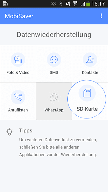 > MobiSaver for Android APP Support >SD-Karte wiederherstellen