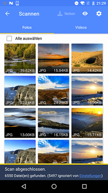 Schritt 2. Vorschau und stellen Sie Daten während oder nach dem Scan wieder her. Wählen Sie die gewünschten und klicken Sie auf Wiederherstellen. Die Dateien werden in einem bestimmten Pfad auf Ihrem Gerät gespeichert.